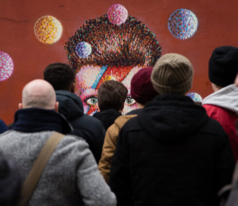 Witness a crowd admiring vibrant street art in urban public spaces, where creativity transforms cityscapes into colorful canvases.